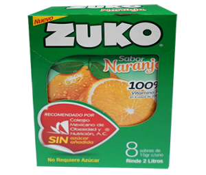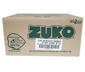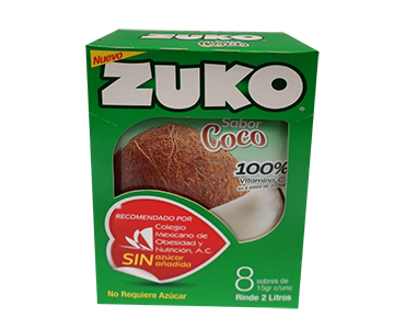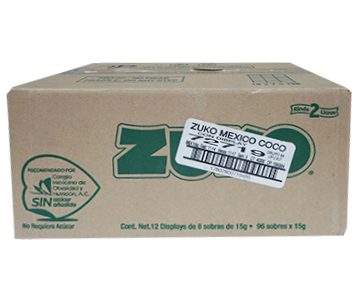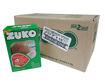 BEBIDA EN POLVO SABOR COCO, MARCA ZUKO, CAJA CON 96 SOBRES DE 13 GR. CADA UNO.