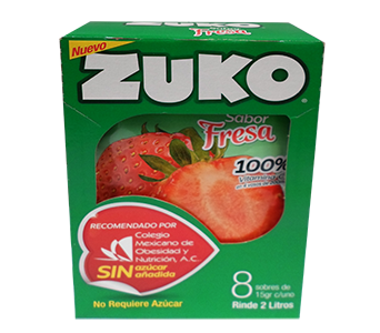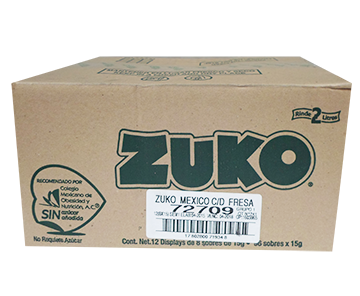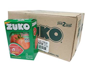 BEBIDA EN POLVO SABOR FRESA, MARCA ZUKO, CAJA DE 96 PIEZAS DE 13 GR. CADA UNO.