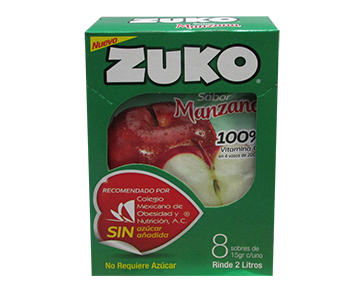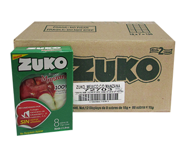 BEBIDA EN POLVO SABOR MANZANA, MARCA ZUKO, CAJA CON 96 SOBRES CON 13 GR. CADA UNO.