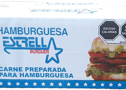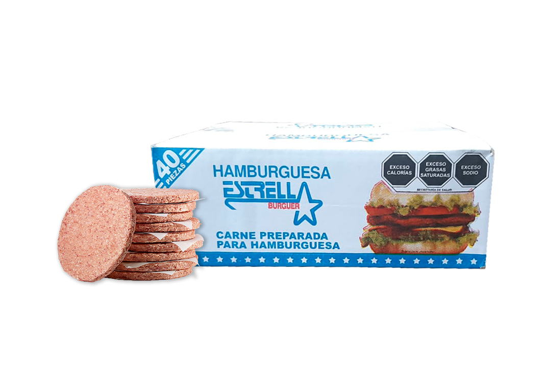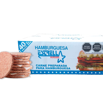 CARNE PARA HAMBURGUESA, MARCA ESTRELLA, CAJA CON 3.76 KG/40 PZ.