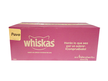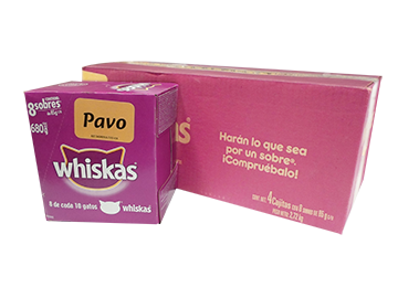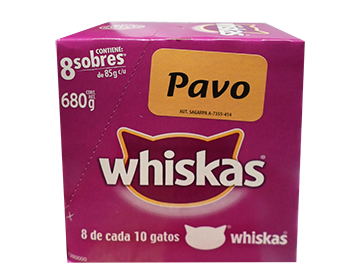 COMIDA PARA GATO EN TROZOS DE PAVO, MARCA WHISKAS, POUCH, CAJA CON 4 PAQUETES DE 8 SOBRES DE 85 GR. CADA UNO.