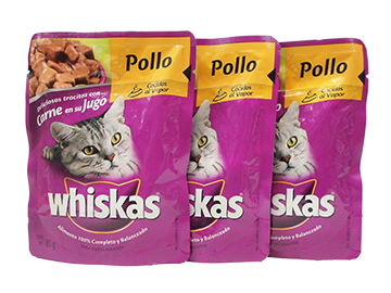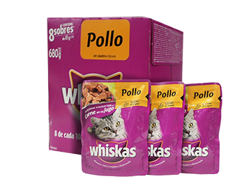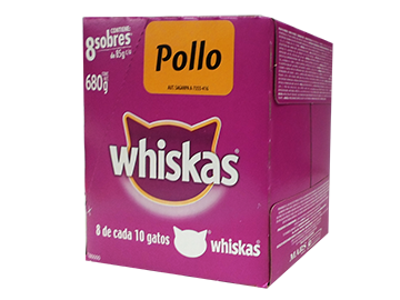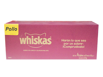 COMIDA PARA GATO EN TROZOS DE POLLO, MARCA WHISKAS, POUCH, CAJA CON 4 SOBRES DE 8 PIEZAS DE 85 GR. CADA UNO.