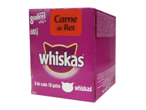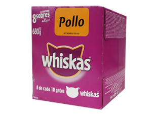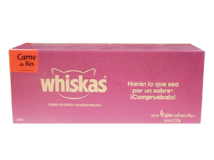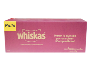 COMIDA PARA GATO EN TROZOS DE SALMON, MARCA WHISKAS, CAJA CON 4 SOBRES DE 8 PIEZAS DE 85 GR.