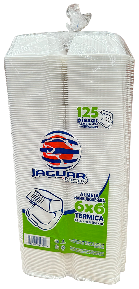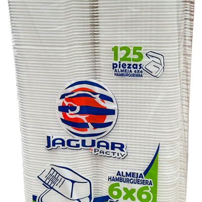 CONTENEDOR PARA HAMBURGUESA 6X6, MARCA JAGUAR, CAJA CON 4 PAQUETES DE 125 PIEZAS.