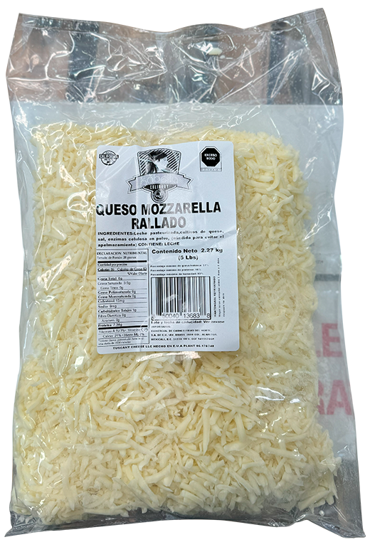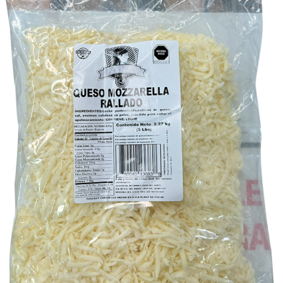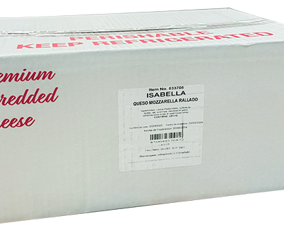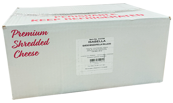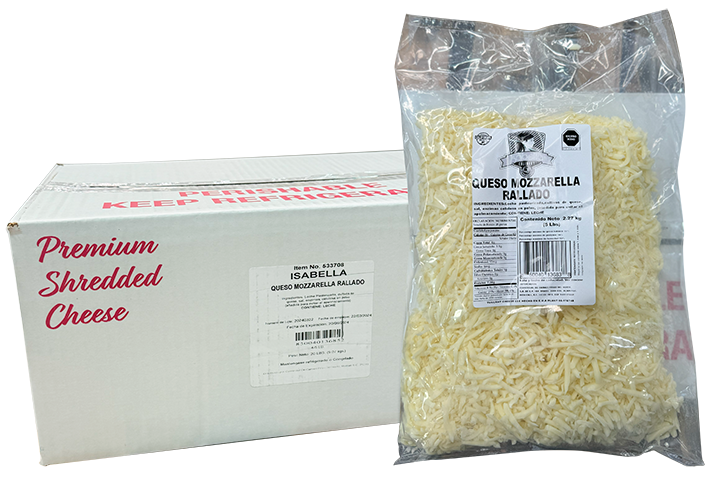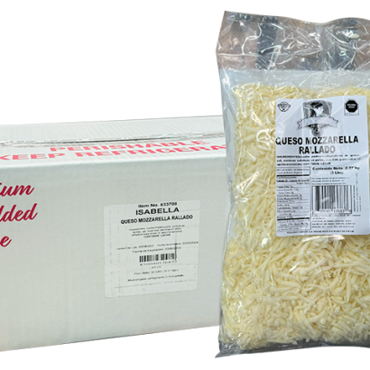 QUESO MOZZARELLA RALLADO, MARCA ISABELLA, CAJA CON 4 PAQUETES DE 5 LB CADA UNO.